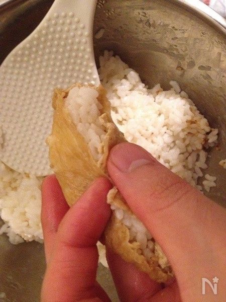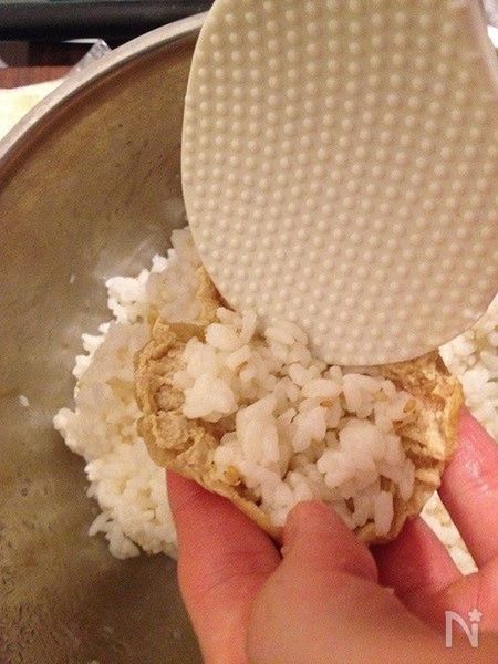 酢飯を詰めていきます。最後は端をつまんで折りたたむようにして閉じます。今回はシンプルに白ごまを混ぜた酢飯です。関東でよく見られる酢飯です。関西では具を混ぜることが多いです。いなり寿司も地域によって全然違う味わいが楽しめるのですね。