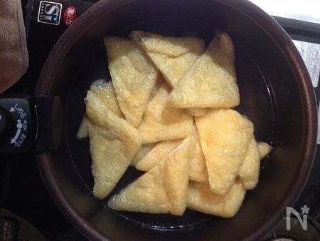 湯を沸かして油揚げを入れ、5分ほどゆで、ざるにあげてしっかり水けをきります。表面についている油をしっかりと抜くことで、味の染み込みがとても良くなります。茹でたらしっかりと水もきってください。