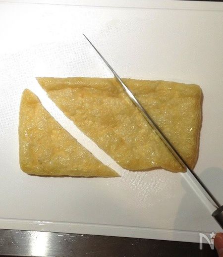油揚げの左右の角の部分を二等辺三角形になるように切ります。三角以外の残った油揚げの部分もとっておき、一緒に味をつけておけば、うどんのトッピングや、混ぜご飯の具としても使えます。