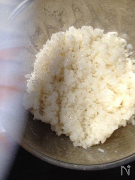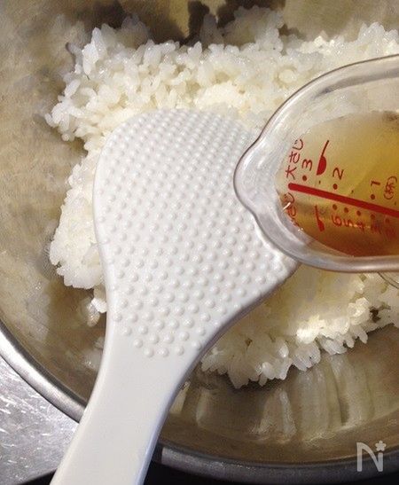 合わせ酢を作ったら、必ずしゃもじを伝わらせてごはんにかけます。直接ごはんにかけてしまうと一点に集中してしまう可能性があるので、この方法がおすすめです。