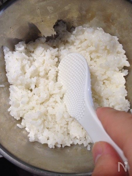 うちわであおぎます。うちわであおぐ本来の目的は「冷ますこと」ではなく、「表面にツヤを出すこと」です。ぴっかぴかなごはんに仕上ります!