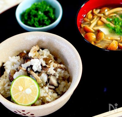 旬のきのこの炊き込みご飯です。 スダチをたっぷり搾っていただきます。