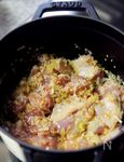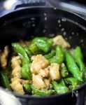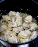 鶏もも肉とA 長葱 1/2本、生姜 20g、煎り胡麻 大さじ2、ごま油 大さじ1、砂糖 大さじ1と1/2、みりん 大さじ1、酒 大さじ1、めんつゆ 大さじ2 をストウブ鍋に入れて よく揉み込む |
