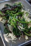 たっぷりの熱湯に塩を入れてつるむらさきをサッと茹で えのきだけの平ざるにあげる 手早く団扇で扇いで冷ます |