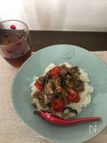 1にあらびきガーリック、醤油、ミニトマト、バジルの葉を入れてサッと炒める。 |