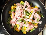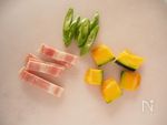 フライパンに、かぼちゃ、いんげん、ベーコンの順に並べ、Aをふりかけます。 | |