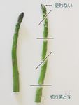 アスパラガスは根元3~4センチを切り落とし、写真のように4つに切る。(穂先は門松には使いません | |