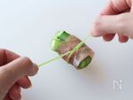 アスパラガスを門松のように置き、生ハムを巻きみつばを結ぶ。 |