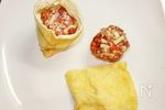 豚チーズ巾着を作る。 Aのにんじんをみじん切りにして、豚ひき肉・ピザ用チーズ・塩・こしょうと 合わせてよくこねる。 半分に分けて丸く形を整え、2.の油揚げに詰める。 |