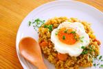 お皿に盛り付け。 カレーピラフの上に目玉焼きをのせて パセリ・ブラックペッパーをちらして完成です☆ |