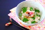 器に盛り付け。 鯛めしの上に、切り分けた鯛をのせて、飾り用の桜の塩漬けをのせる。 三つ葉をざく切りにしてのせて完成です☆ |