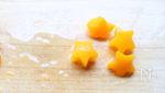 黄桃(缶詰)は星型に型抜きする。 厚い部分は、包丁で薄く切る。 |