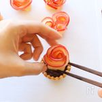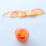 2.のりんご4枚を並べてくるくる巻いてバラを6個作る。 (※りんごの枚数を変えることで、バラの大きさに変化を加えてもかわいいと思います!) |