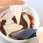鍋にお湯を沸かし火を止めて、製菓用チョコレートを 湯煎にかけて溶かす。 湯煎からおろして生クリームを2~3回に分けて加えてよく混ぜる。 |