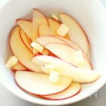 耐熱容器にりんご・砂糖をのせて、 バターを小さく切って所々に乗せてふわっとラップをかけ、電子レンジ(500w)で3分半加熱する。 | |
