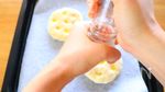 打ち粉(薄力粉・分量外)をしたまな板に生地をのせて、半分に切る。 手で丸く伸ばして、指で数カ所くぼみをつける。 (☆フォカッチャ特有の表面のくぼみは、生地の膨らみを均一にするためです。) |