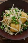 小さながんもとえのきだけ、塩と油を鍋に入れて蓋をし、蒸し焼きするだけの簡単さですが、塩とえのき、ごま油の風味がとってもいいのです。がんもの含め煮もいいですが、今回のレシピは短時間でできるから朝食にもピッタリ。
