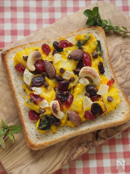 市販のカボチャサラダをベースに、ドライフルーツやミックスナッツを散りばめて、カラフルなトーストにしてみました。