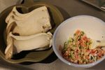 エリンギに2枚分に和えた具を1/4ずつ挟む。 上にスライスのパルミジャーノをひとつまみ1g程度のせて、トースター強で10~15分焼く。(オーブン200℃で焼いてもOK) |
