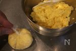 *スクランブルカボチャの作り方 混ぜた卵液を油を温めたフライパンに入れて混ぜながら加熱し、スクランブルエッグにする。チーズなどが入っているので、ややねっちりに仕上がります。 広げたラップの真ん中に1/3ずつ置き、ぎゅっとつぶれ気味の茶巾包みにしてそのまま冷ます。 *少しゆるいかな?というときは包んだ状態で電子レンジ加熱して下さい。 冷めたらラップを外して、青菜の茎や青ねぎでヘタを差す。 |