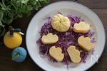 このままでもOKですし、海苔で顔を作っても。 刻んだ紫キャベツに乗せるだけでも雰囲気出ます♪ |