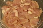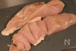 鶏むね肉は縦に半分に切り、それぞれを肉の繊維を切るように1cm厚の削ぎ切りにする。 | |