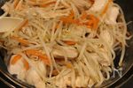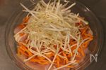 人参は細切りや薄切りにして肉の上に広げ、その上にもやしをのせ、醤油をもやし全体に回しかける。 | |