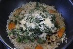 フタをあけ、ほうれん草と粉チーズを加えてひと混ぜし、再びフタをし2分~5分加熱する。 (加熱中は混ぜません。味見をして好みの米のかたさになるよう加熱してください。) |