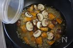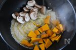 フライパンにオリーブオイル、米、かぼちゃ、玉ねぎ、マッシュルームを入れて中火で2分ほど炒める。 その間に、耐熱容器に水、コンソメ顆粒を入れて電子レンジ600W 2分加熱する。 |