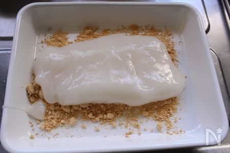 5. わらび餅が固まったら、バットにきな粉を入れ、その上にタッパーから取り出したわらび餅をのせます。