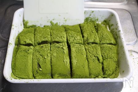 6. わらび餅が固まったら、バットにきな粉を入れ、その上にカードなどを使ってタッパーから取り出したわらび餅をのせます。上面にも抹茶をまぶしてからカードや包丁で一口大に切り、切った断面にも抹茶をまぶしてください。この時、茶こしを使って抹茶をまぶすと少量で済むので無駄が出ませんよ。