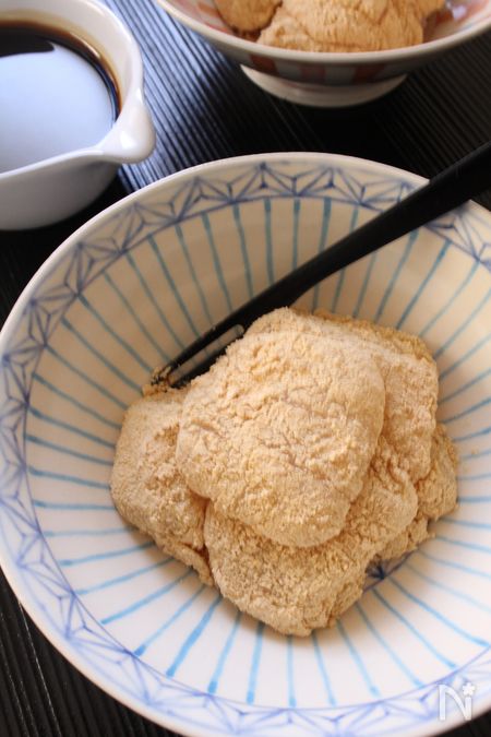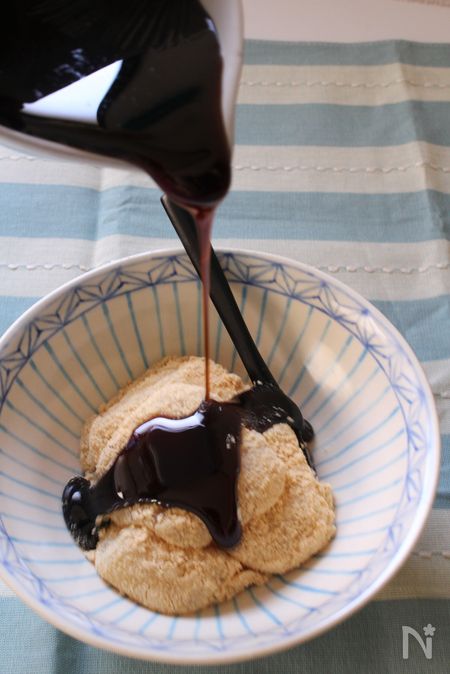 6. 上面にもきな粉をまぶしてからカードや包丁で一口大に切り、切った断面にもきな粉をまぶしたら、黒蜜をたっぷりかけて召し上がれ♡