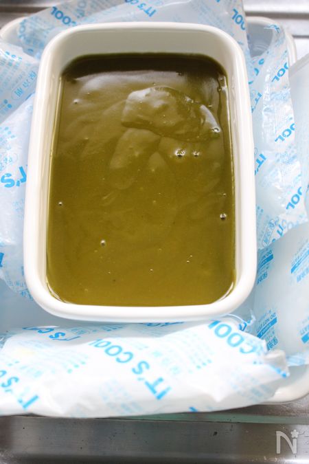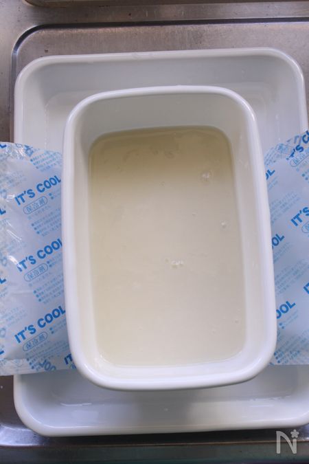 4. もう一度ラップをかけて電子レンジで更に3分加熱し、先ほどと同じようにぐるぐるとよく混ぜたら、水でぬらしたタッパーに流し入れて冷まし、粗熱が取れたら冷蔵庫で冷やし固めます。