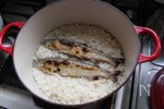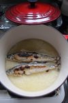 浸水しておいた米にAの調味料を入れて混ぜ、1の鮎をのせてルクルーゼで炊きます。 ★目安として 蒸気が上がるまで強火(4分)→その後蒸気が出続けくらいの火加減(中弱火で8分)→火を止めて蒸らし(10分) 火力や、水の温度や、内容量で多少変わりますので調整してみてください。 |