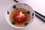 トマトの皮をむき、出汁が温かいうちにに浸します。 頭が出る場合は、キッチンペーパーなどをかぶせて全体に味がなじむようにします。 |