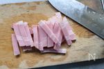 玉ねぎはせん切りに、ベーコンは、3センチ位の拍子木切りにします。 | |