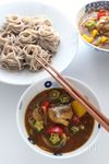 器にサバカレーのつけ汁、冷たい蕎麦をそれぞれ盛り付けます。 |
