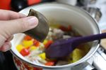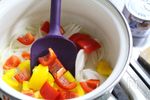 鍋を熱して、サラダ油をひいたら、玉ねぎ、パプリカを炒めます。 | |