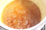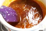 キャラメルソースを作ります。 鍋にA 上白糖 60g、水 大さじ1 を入れて火にかけ、好みの濃さになるまで砂糖を焦がしていきます。頃合いになったら火からおろして、少量ずつ生クリームを加え混ぜます。(はねやすいのでやけどに気を付けましょう。) 仕上げのソースとして30gくらい器にとっておきます。 |