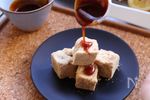 食べやすい大きさに切り、きな粉をまぶして キャラメルソースをかけて完成です。 ※キャラメルソースが固まってしまった場合はレンジで10秒くらい温めるととろりとします。 |