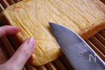 巻きすか鬼すだれを水で濡らして、余分な水分を払ってから卵をのせます。 巻きやすいように下から1cmぐらいの部分に包丁で軽く切り込みを入れてから隙間があかないようにきつめに巻いていきます。 |