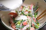 万能ねぎは3cm程の長さに切り、カニカマは大きめにちぎり、ボウルに入れて、薄力粉大さじ1を全体にまぶしておきます。 | |