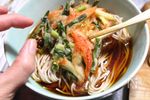 鍋に湯を沸かしゆでそばをさっと湯がいて、ざるで湯切りします。 器にそば、そばつゆ、かきあげを盛り、すりおろした生姜を添えます。 |