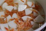 炊飯器に切った長いもと干し桜えびをのせて炊きます。 | |