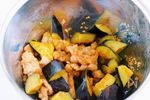 同じフライパンに、水気を拭いたなすを入れ、全体に油を絡ませる。 蓋をして中火にかけ、時々混ぜ合わせながら、5分ほど蒸し焼きにする。 ★油が足りなければ、大さじ1プラスしてください。 |