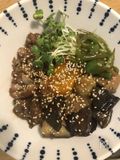 なすに火が通ったら、豚コマ切れ肉(②)と共にB ニラ(ザク切り) 2〜3本、にんにく、生姜(みじん切り) 各1片、醤油、酢、砂糖 各大さじ1と1/2、白いりゴマ 大さじ1 が入ったボウルに入れ、よく混ぜ合わせたら、できあがり〜(^ε^)♪ |