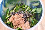 ボウルに1・A 塩昆布 15g、ツナ缶 1缶(70g)、ごま油、レモン汁 各大さじ1、粗挽き黒胡椒 適量 を入れ(ツナ缶は汁ごと)、よく混ぜ合わせる。 |