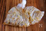 もやしが熱いうちに、A めんつゆ(3倍濃縮)、ポン酢じょうゆ 各大さじ1、和風だしの素 小さじ1/2、にんにくチューブ 1〜2cm と共にポリ袋に入れ、よく揉み込む。空気を抜いて口を閉じ、そのまま15〜30分おく。 |
