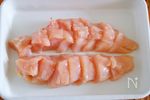 ・鶏肉は、皮をとり、フォークで数カ所さす。縦半分に切り、さらに1.5cm厚さのそぎ切りにする。 ・B しょうゆ 大さじ1強、酒、みりん、砂糖 各大さじ1/2、しょうがチューブ 1〜2cm は、合わせておく。 |