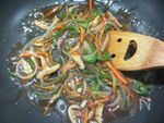 フライパンになたね油を中火で熱し、にんじん・玉ねぎ・しいたけ・ピーマンを炒める。野菜に火が通ったら、塩、こしょうをふって、サッと炒め合わせる。 | |